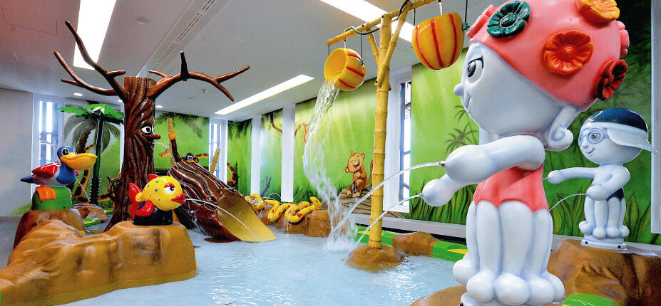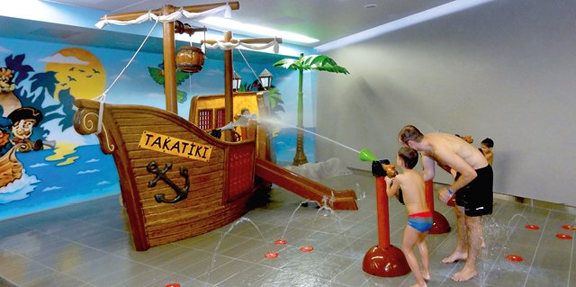 Für kleinere Kinder gibt es eine tolle Plantschwelt und ausserdem ein Piratenschiff, Rutschen und Bobbycars, um durch das Wasser zu fahren. Für grössere Kinder gibt es eine abenteuerliche Rutsche und riesige Schwimmmatten zum Toben.