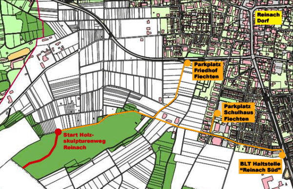 Der Weg zum Holzskulpturenweg ist mit Wegweisern beschildert: von der BLT-Haltstelle „Reinach Süd“ ist der Start rund 1.4 km entfernt, vom Parkplatz des Schulhaus Fiechtens sowie vom Parkplatz des Friedhof Fiechtens rund 1 km (beim Start stehen keine Parkplätze zur Verfügung).