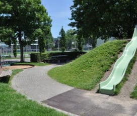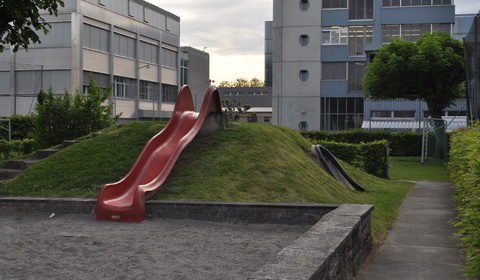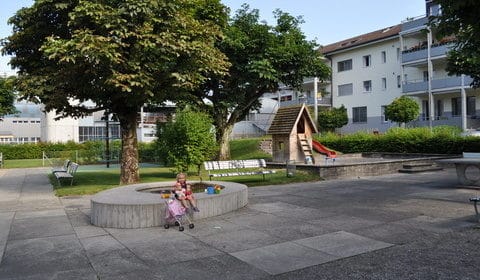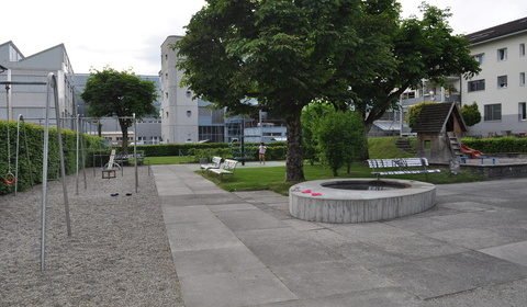 Die bunt bemalten Sitzbänke laden zum Verweilen ein. Der Spielplatz ist grosszügig angelegt und die vielen Spielgeräte lassen die Kinder kaum verschnaufen. Vom Kunstturner bis zum Ballsportler, jeder findet hier seine Lieblingsbeschäftigung. Es hat einen Tischtennistisch mit festem Netz, wie auch eine grosse Spielwiese, welche sich für Fussball und Frisbee eignet. Der grosse Sandkasten mit dem Häuschen ist der Anziehungspunkt bei den Kleinen. Also Sandspielsachen nicht vergessen! Dank der Einzäunung können sich die Eltern unbesorgt unterhalten und eine Wurst vom kleinen Grill geniessen.